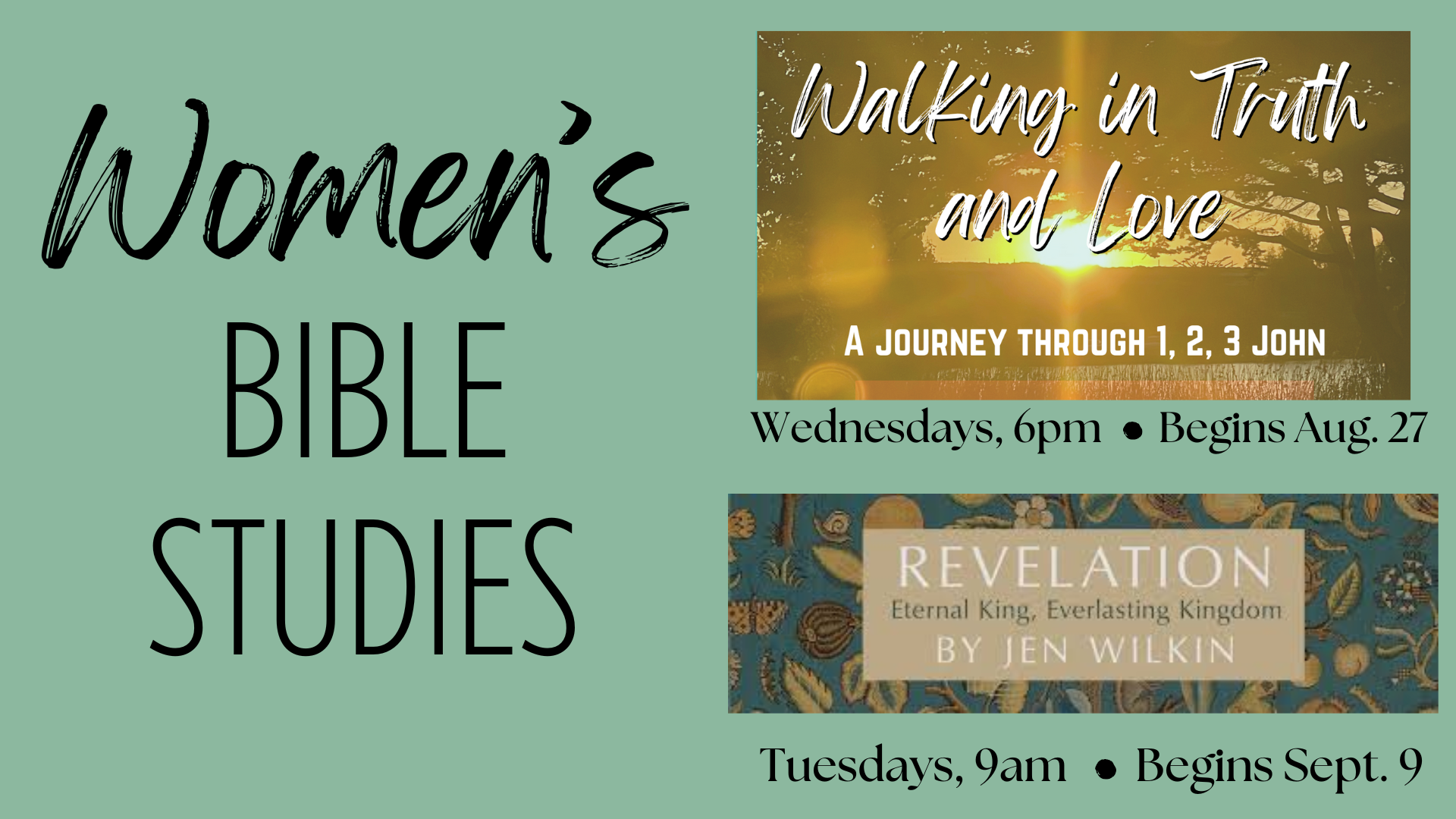 Wednesdays: 6PM starting on August 27th - studying 1,2 and 3 John - Abiding in Christ, loving others, and standing firm in the truth.