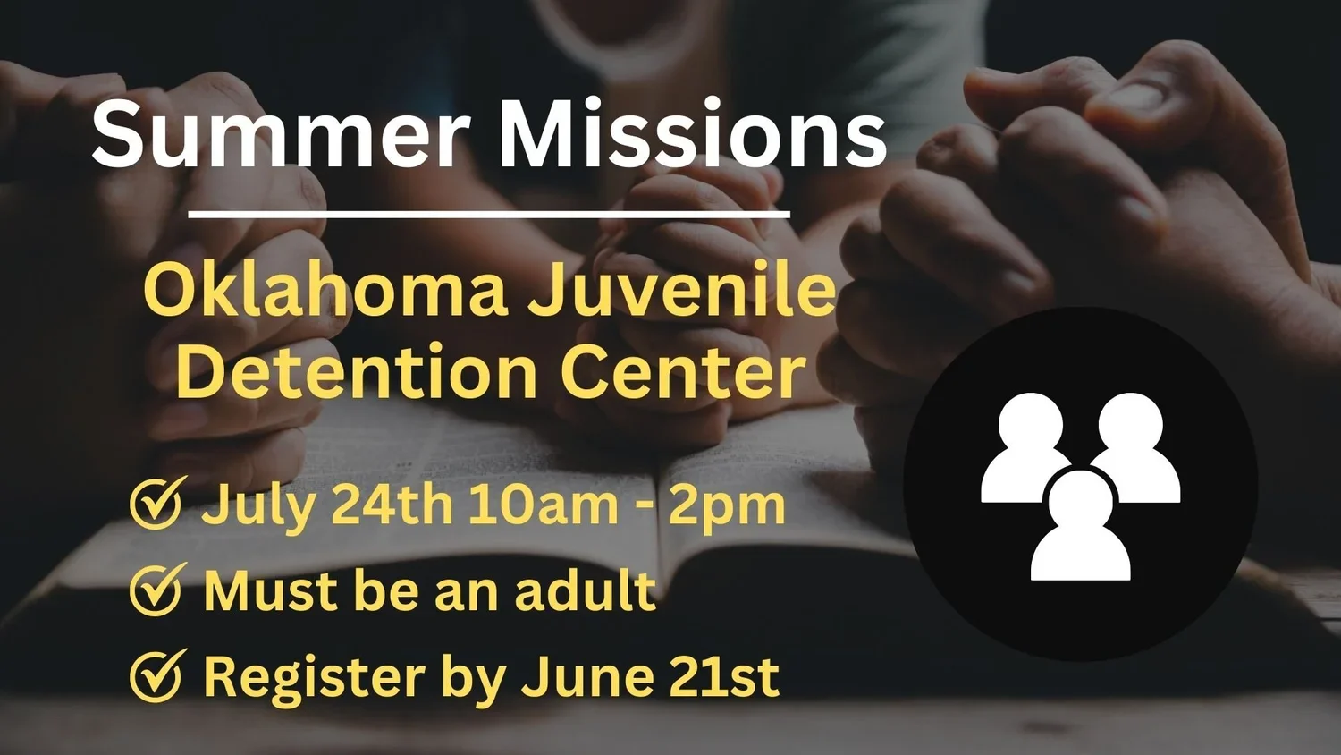 Join us for an opportunity to go into the Oklahoma Juvenile Detention Center (OJDC) to share the gospel with teenagers who are in the facility. We will bring these teens lunch, have a gospel presentation, and the opportunity to work one on one sharing the Gospel with students. Being a secured facility, background checks and other protocols will need to be followed.