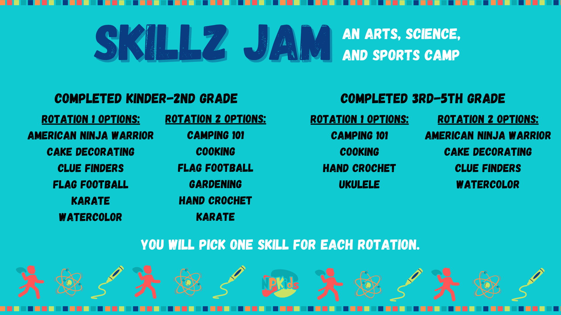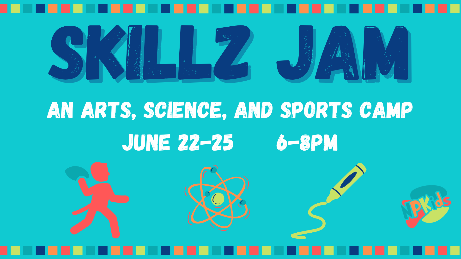 Skillz Jam is a week of learning new sports, arts, and science skills! Think of it as a STEM camp with sports too! Each child will pick two skills to participate in throughout the week, and on Thursday night we will have an Open House for parents to see all that we have learned. Each night, kids will also participate in a fun kid’s worship service where we will sing and learn some amazing things about God!